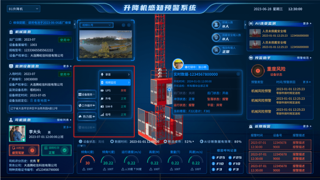 升降機感知預警系統(tǒng)由物聯(lián)網(wǎng)終端和開放平臺組成,終端采集升降機限位數(shù)據(jù) , 能夠?qū)λ緳C進行語音提醒風險情況,如超重、超員、沒佩戴安全帽、關(guān)門沒到位、平層未到位等。