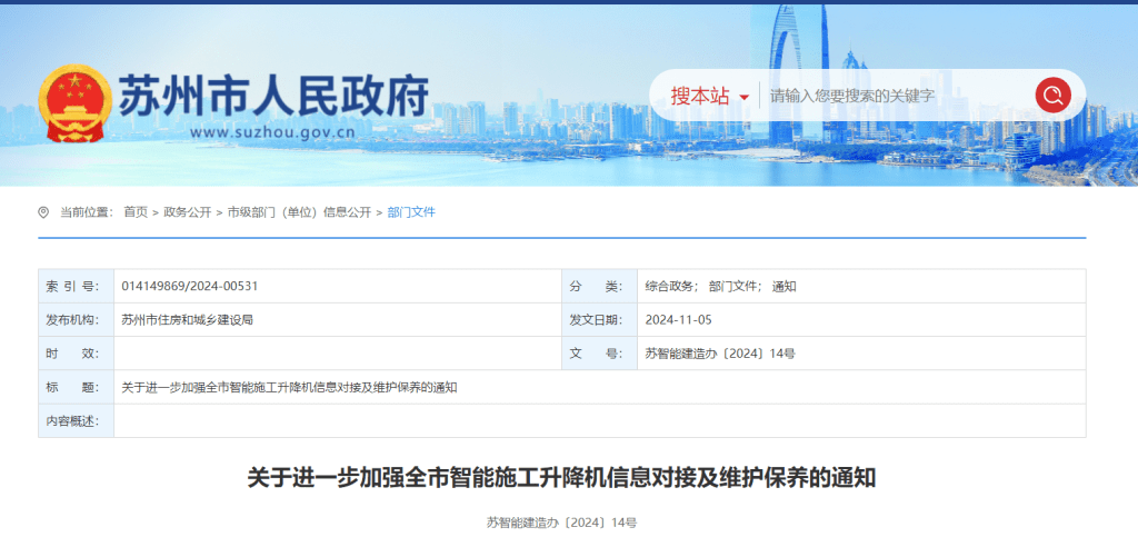 政策:《關(guān)于進(jìn)一步加強(qiáng)全市智能施工升降機(jī)信息對(duì)接及維護(hù)保養(yǎng)的通知》?– 蘇州市人民政府?