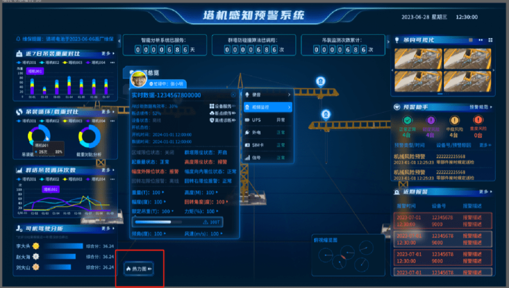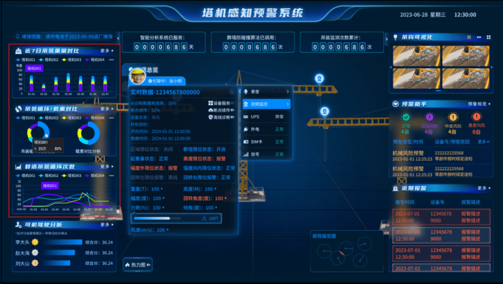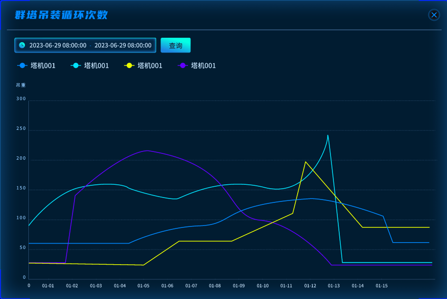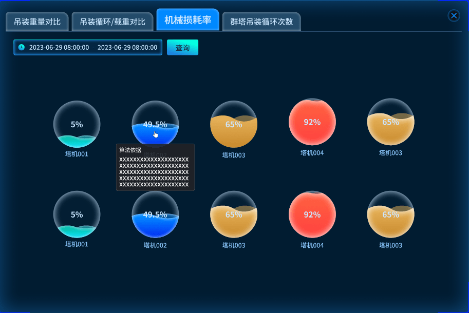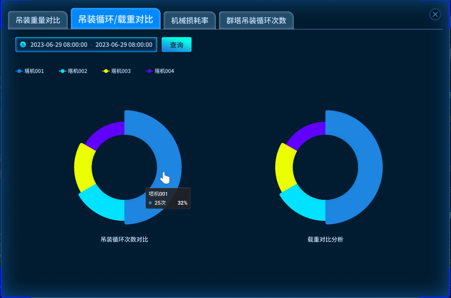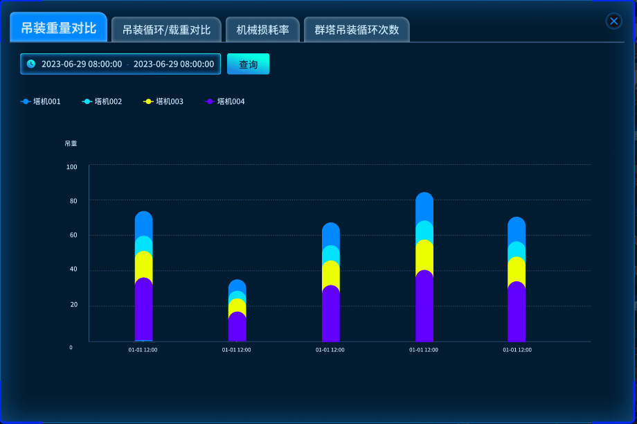 通過對塔機吊重、循環(huán)、機械損耗率、群塔吊裝環(huán)次等數(shù)據(jù)進行可視化呈現(xiàn)。