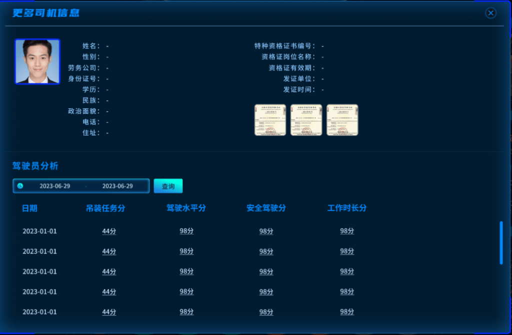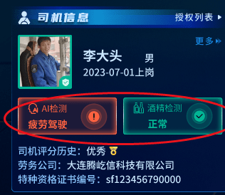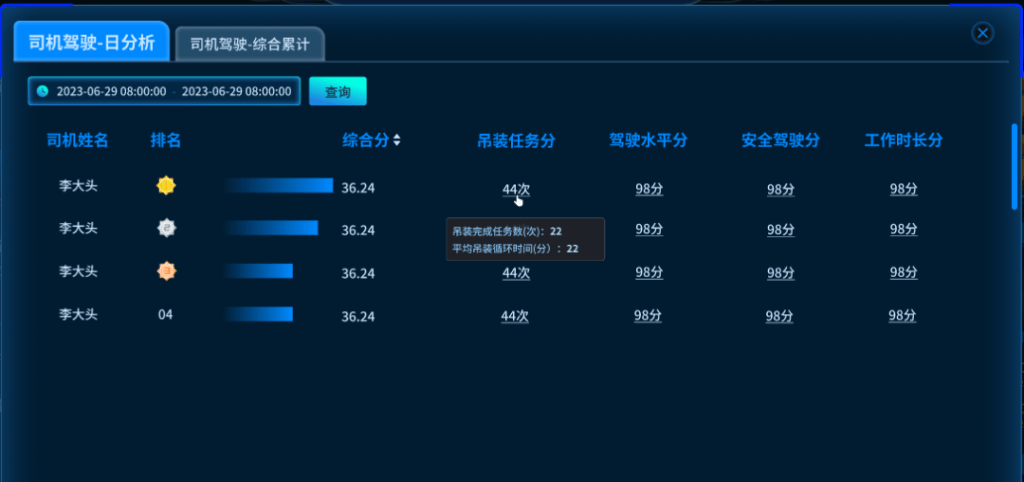 該功能通過從司機的駕駛水平、吊裝任務(wù)、安全駕駛、工作時長這四個維度進行數(shù)據(jù)采集、融合分析,進而對司機駕駛行為進行綜合評分。