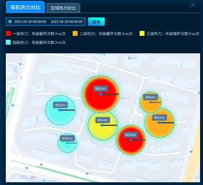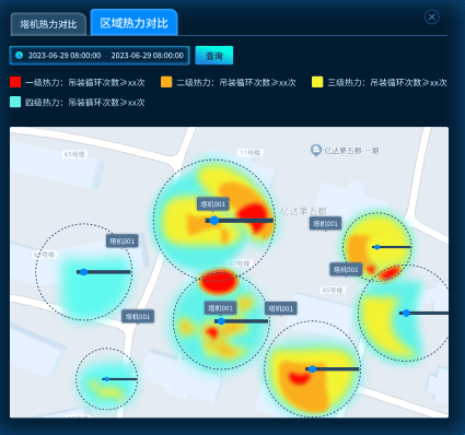 通過對塔機吊裝循環(huán)熱力分析,清晰看出單位時間內(nèi),不同塔機的吊重任務(wù)密集情況。