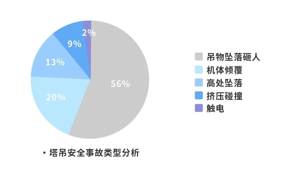 眾所周知,塔機是建筑項目上必不可少的機械設(shè)備,使用率高安全事故也較高。塔機易出現(xiàn)傾覆、高處墜落、吊物墜落砸人三種類型的事故,據(jù)統(tǒng)計占比高達89%。
