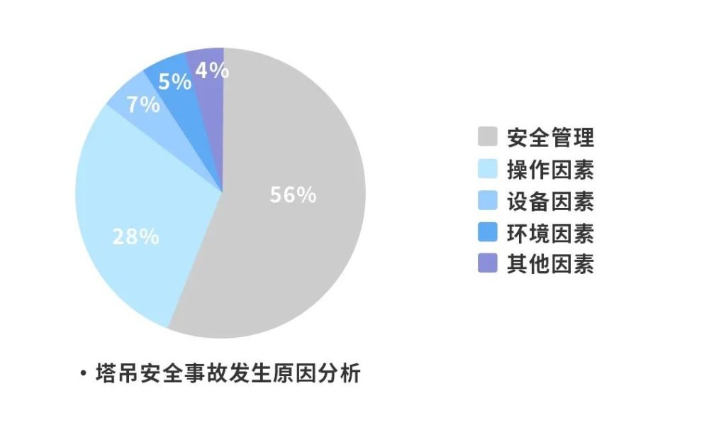 這些事故類型不僅發(fā)生頻率高,而且后果嚴重,往往會導(dǎo)致人員傷亡和財產(chǎn)損失,甚至可能引發(fā)二次傷害。56%安全管理不當(dāng),28%塔機司機操作因素。