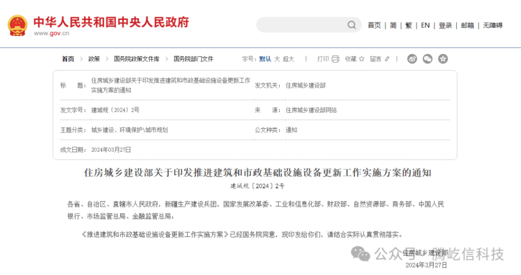 3月27日住房城鄉(xiāng)建設部印發(fā)《推進建筑和市政基礎設施設備更新工作實施方案》署各地以大規(guī)模設備更新為契機,加快行業(yè)領域設施設備補齊短板、升級換代、提質增效,提升設施設備整體水平,滿足人民群眾高品質生活需要,推動城市高質量發(fā)展。