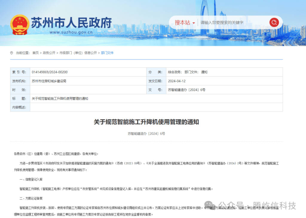 4月12日,作為智能建造的排頭兵-江蘇省住建廳發(fā)布了《關于做好智能施工升降機使用管理的通知》,內容涉及到智能升降機產權辦理、安拆、維保、安監(jiān)系統(tǒng)管理以及日常安全管理等諸多方面。