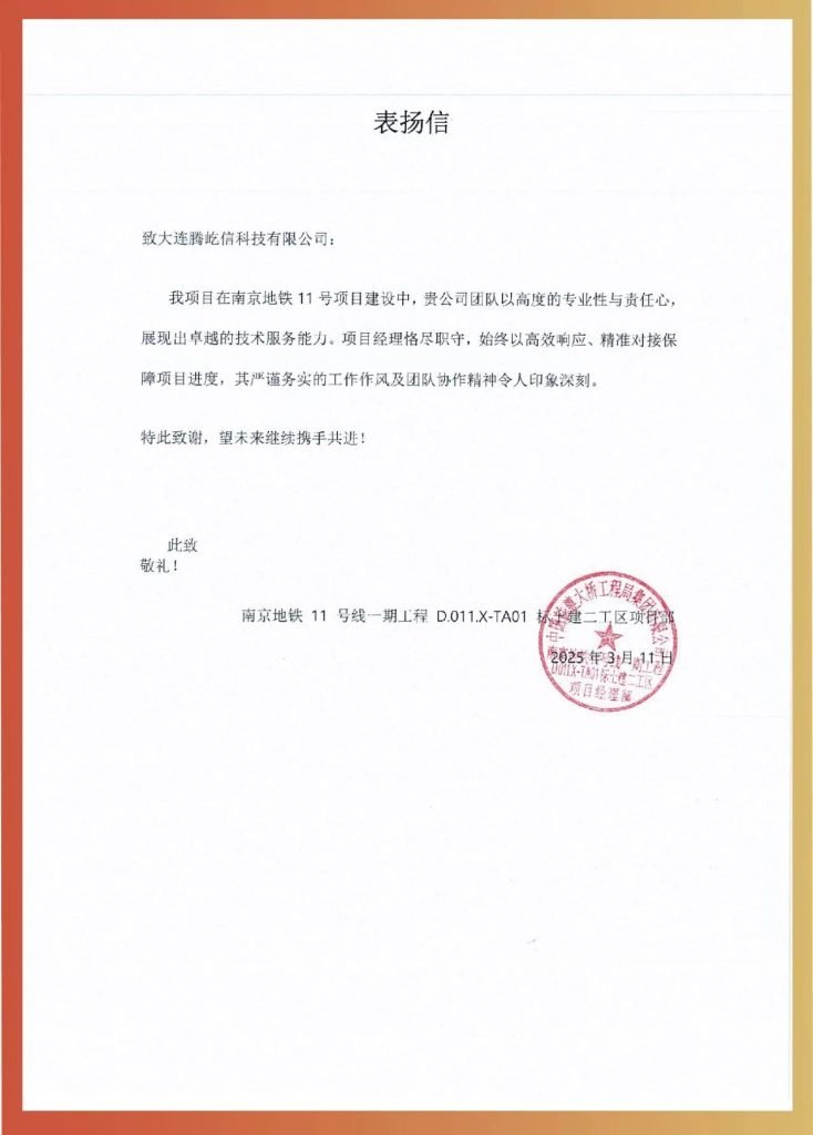 近日,大連騰屹信科技有限公司收到來自南京地鐵11號(hào)線項(xiàng)目建設(shè)方的表?yè)P(yáng)信。信中高度肯定了我司團(tuán)隊(duì)在項(xiàng)目施工中展現(xiàn)的專業(yè)技術(shù)能力、高效服務(wù)響應(yīng)及嚴(yán)謹(jǐn)務(wù)實(shí)的工作作風(fēng)。這份認(rèn)可不僅是對(duì)項(xiàng)目團(tuán)隊(duì)的全方位褒獎(jiǎng),更是對(duì)騰屹信”以客戶為中心”服務(wù)理念的又一次生動(dòng)詮釋。